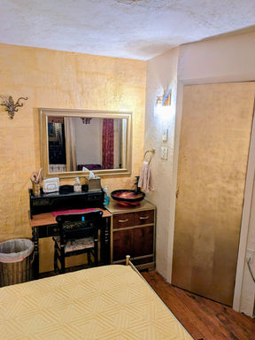 The luxurious Egyptian room makes you feel like you are sleeping in one of the pyramids of Egypt. The queen size bed under the Egyptian mural on the ceiling is perfect for two guests. The golden, purple and red hues, as well as the Egyptian art makes for an vibrant and exciting retreat. Like all our rooms there is a Fire TV, fridge, microwave, blow dryer, iron, ironing board, central HVAC as well as window AC and portable heater so you may adjust the temperature of your individual room. The Egyptian room has its own private half bathroom in the room, installed May 2025. To shower. guests use the new walk-in shower in the main bathroom located directly beside the Egyptian room.
